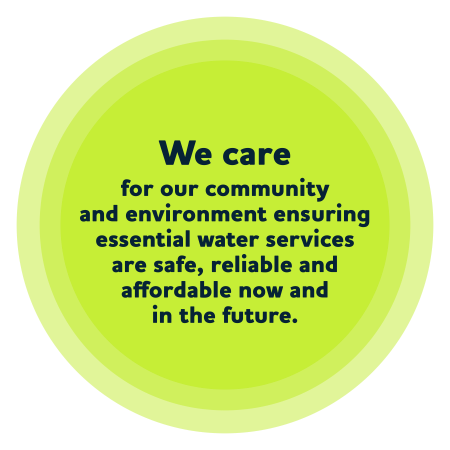 We care for our community and environment ensuring essential water services are safe, reliable and affordable now and in future.